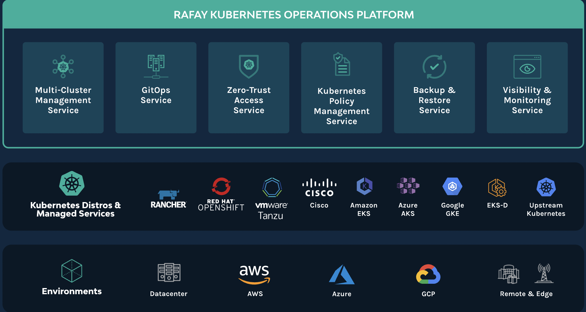 At Rafay, we’ve built a Kubernetes management platform that streamlines all aspects of managing Kubernetes, especially as your K8s fleet grows to include many individual clusters in multiple clouds. Rafay provides all the tooling you need to successfully deploy and manage Kubernetes, without being overly prescriptive or locking you into specific clouds, infrastructure, or Kubernetes distributions, and Rafay integrates with other popular tools in the Kubernetes ecosystem.Our Kubernetes Operations Platform (KOP) unifies lifecycle management for both clusters and containerized applications. Key capabilities include: