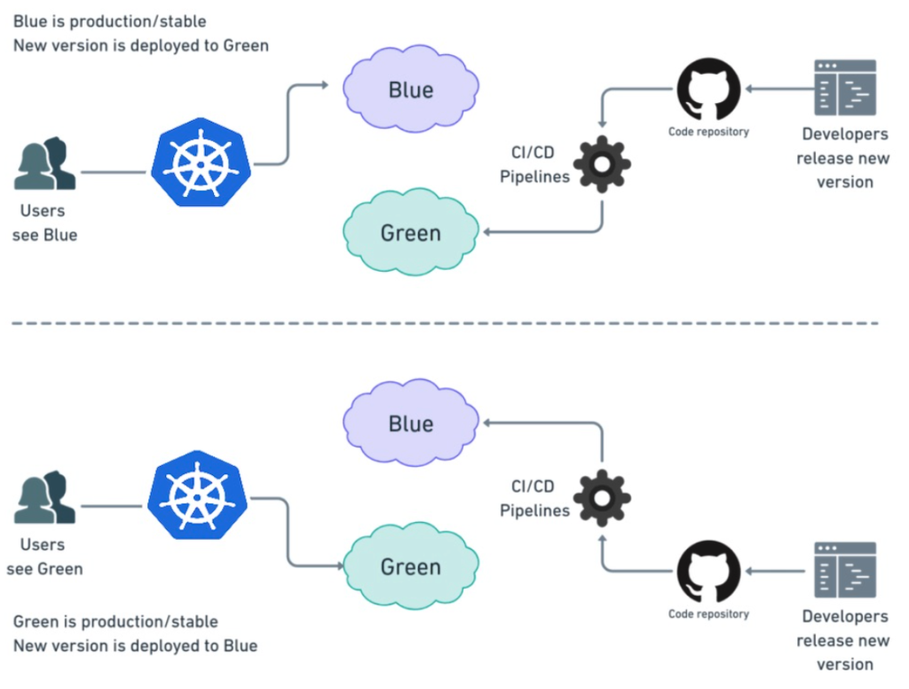 More advanced deployment patterns such as blue-green and canary deployments can be implemented with a little additional effort. Blue-green: In a blue-green deployment, there are two versions of the application, but only one version is live and accessible to users at a time. This works well for applications where a rolling update won’t work but you don’t want any downtime. This approach also enables you to roll back to the old version immediately if something goes wrong.