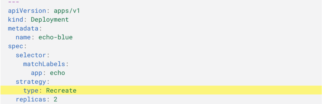 - Recreate: The Recreate strategy ensures that old and new pods do not run concurrently. This can be useful when synchronizing changes to a backend datastore that does not support access from two different client versions.