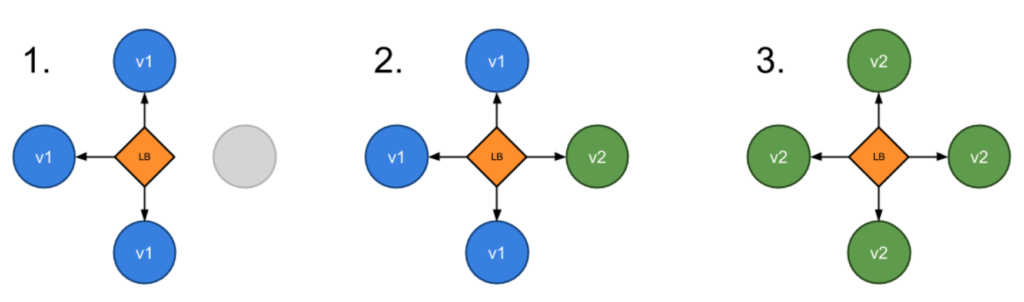 - Rolling update: The RollingUpdate strategy ensures there are some pods available to continue serving traffic during the update, so there is no downtime. However, both the old and new pods run side by side while the update is taking place, meaning any data stores or clients must be able to interact with both versions.