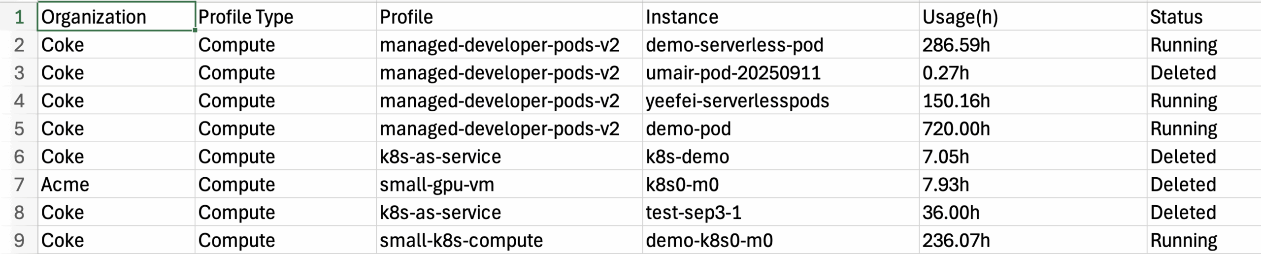 Important: Columns include organization, profile type, profile, instance, usage (hours), and status — ideal for billing ETL and dashboards.