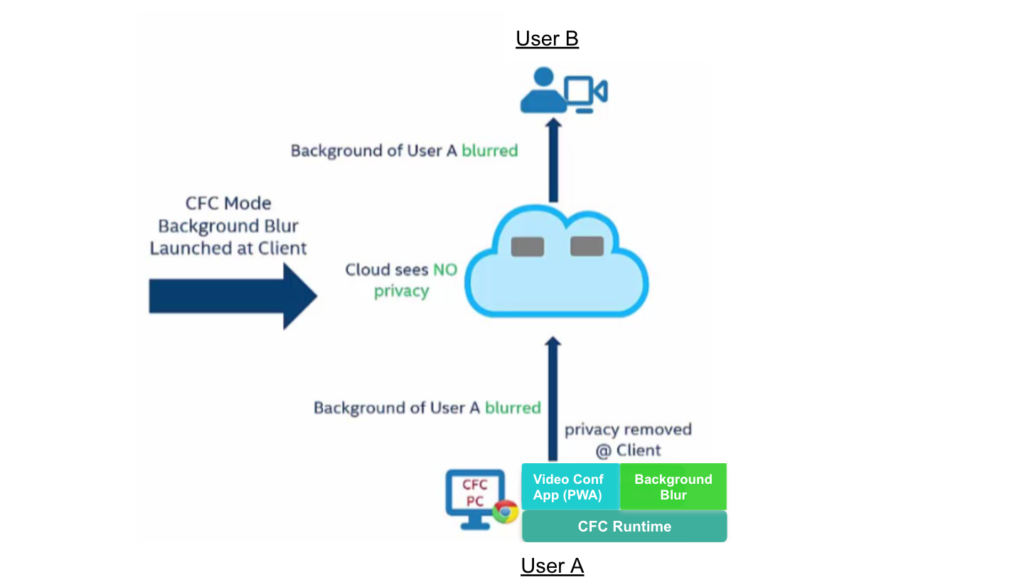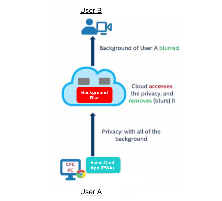 Let's take an example of a video conference application with two users in the call. The users want to blur the background image for privacy reasons. When User A starts the camera, the video stream is forwarded to a cloud service to blur the background. The below diagram shows the above scenario. As you can see, the privacy information has already crossed the device boundary, and the cloud service provider has access to the data.