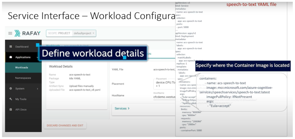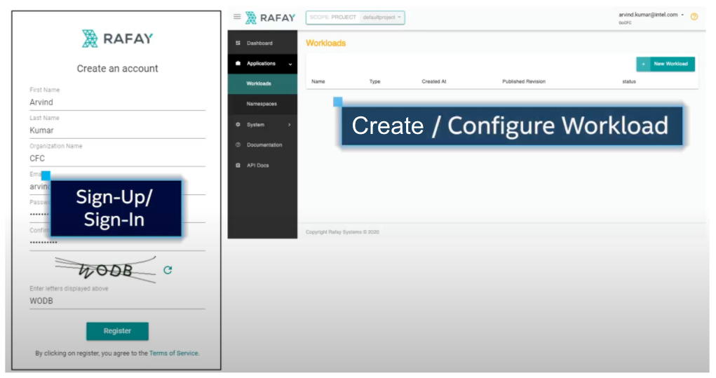 Rafay’s Kubernetes Operations Platform supports the CFC Orchestration APIs. Using Rafay’s SaaS solution, ISVs can configure the workload/microservices that can be offloaded to CFC-enabled client devices. How easy is this? With Rafay, it takes three easy steps:Step 1: Signup on the Rafay Kubernetes Operations Platform and create a workload: