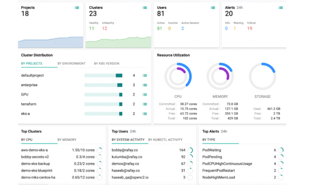 Rafay dashboards let you visualize Kubernetes metrics and events gathered, including resources consumed, user and access activity, critical alerts, and the overall health of every cluster and application deployed.
