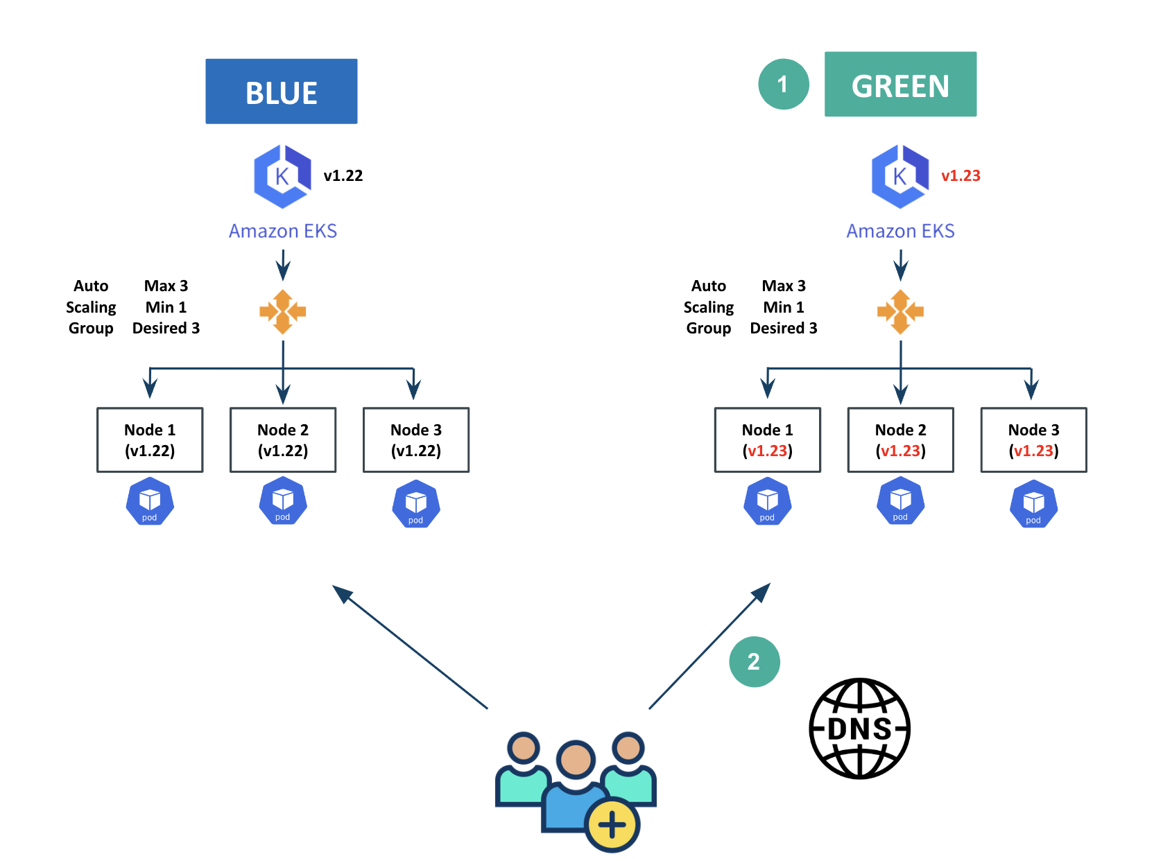 Blue/Green approach is well suited for scenarios where an extremely low blast radius is required. With a blue-green upgrade strategy, users have the advantage of running their applications for an extended time period (Blue/Green type) on two clusters, one with the "older" Kubernetes version and the replacement with the "newer" Kubernetes version. Administrators have the option to switch back and forth between the old and new clusters as required.