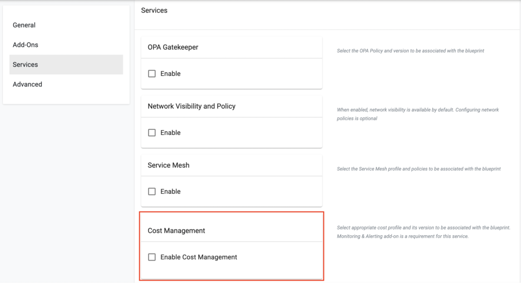 Cloud providers bill at the resource level (e.g., nodes) and hence are unable to provide visibility into the cost structure for scenarios where clusters are shared between teams. This would require the collection and aggregation of very granular resource utilization metrics, and is beyond the scope of what cloud vendors provide with their cost reports. The most important piece of information that you need, namely ‘what is the cost of running this application or namespace or an add-on?’ therefore remains unanswered.It is possible to stitch together a DIY solution using OSS tooling but the cost to set them up and operate is a significant drain of time and resources that could be spent better elsewhere focusing on more important challenges. Rafay’s Kubernetes Cost Management Service is a turnkey solution that imposes zero burden on enterprises, with no additional infrastructure to install, operate, or manage over time. All it takes is a simple checkbox to enable the K8s Cost Management service in a cluster blueprint, as seen here: