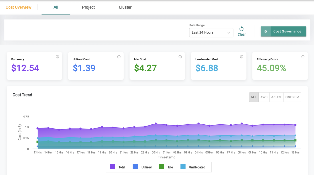 Enterprises can either use the out-of-the-box profiles which calculate costs based on cloud vendors’ publicly available rate cards or you can create custom profiles to ensure that cost metrics are accurate by taking your organization’s custom pricing and Kuberenetes cluster type into consideration.The Cost Overview dashboard shows a comprehensive view of actual costs. It is possible to view these costs for your entire fleet or just a cluster, a single namespace or a project. The flexible time scale and cloud vendor dimensions lets you deep dive into the costs to the most granular level. The efficiency score, which is the ratio of your spend on allocated resources and leased resources, helps you evaluate and right size your kubernetes clusters with a single percentage number.