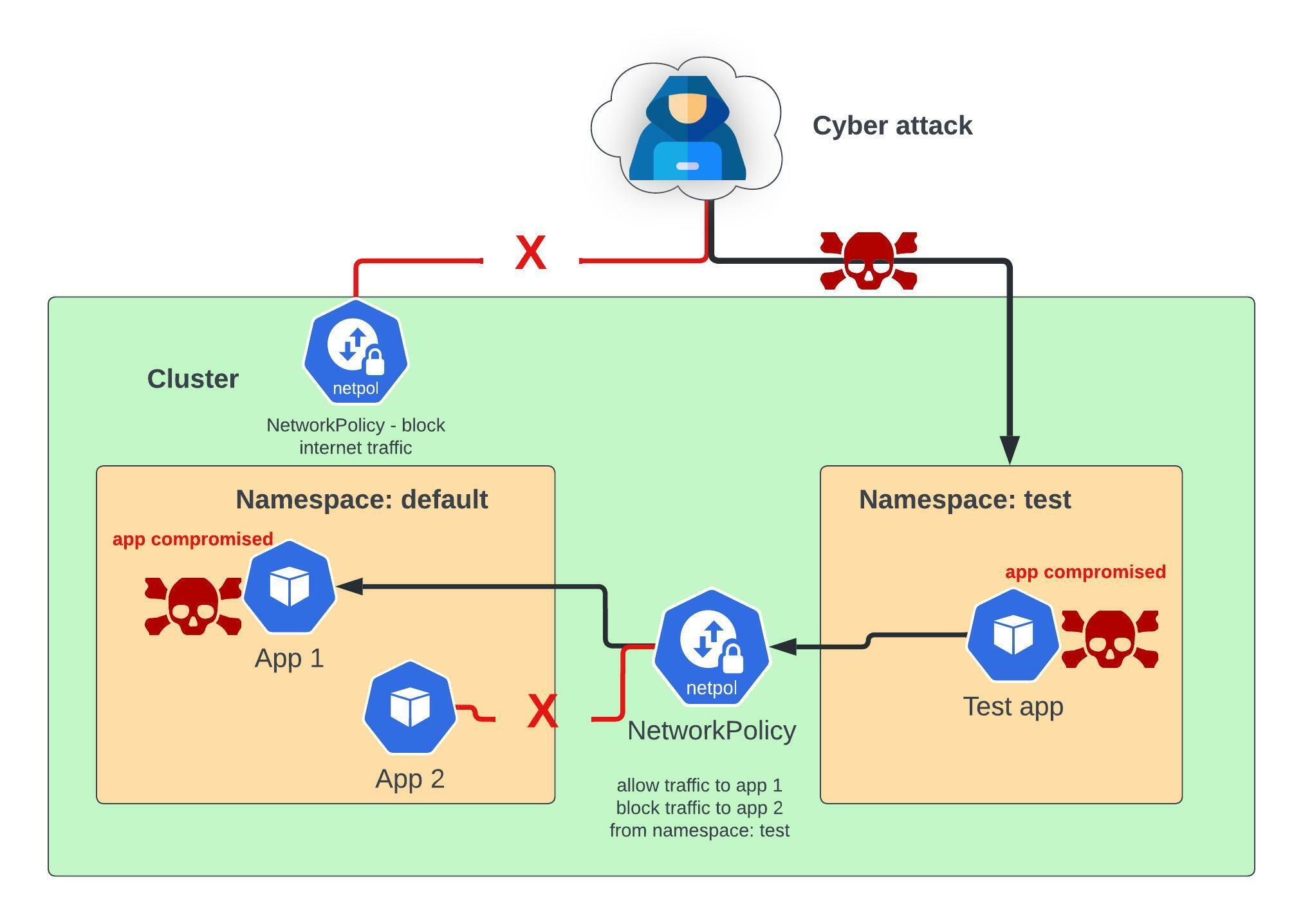 The example above showcases the importance of network policies for north-south and east-west protection. Notice that the default namespace is protected from the internet but the test namespace is not. If the test namespace is compromised, that means it can laterally reach out to apps even in the default namespace. Creating a network policy protects east-west traffic from reaching app 2, app 2 is protected whereas app 1 is compromised because no east-network network policy rule was created for it.In addition, network policies can also be used to enforce isolation in shared cluster scenarios. For example, each team or application can have its own namespace and you can enforce that pods and services in one namespace cannot talk to pods and services in other namespaces.
