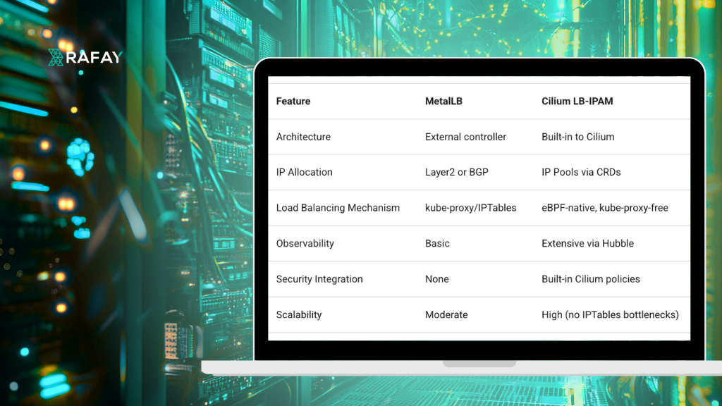 MetalLB, while effective, introduces separate daemons, protocol configuration, and scaling challenges. In contrast, Cilium LB-IPAM centralizes IP management, load balancing, and BGP control—all within the Cilium control plane and data plane—ensuring consistent observability, lower latency, and simplified operations. The table below helps compare Cilium LB-IPAM and MetalLB.